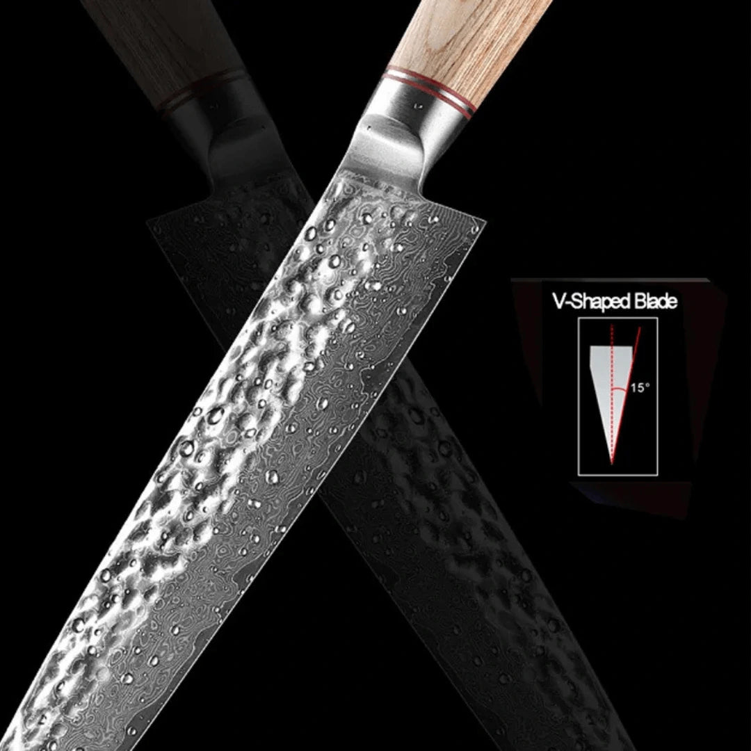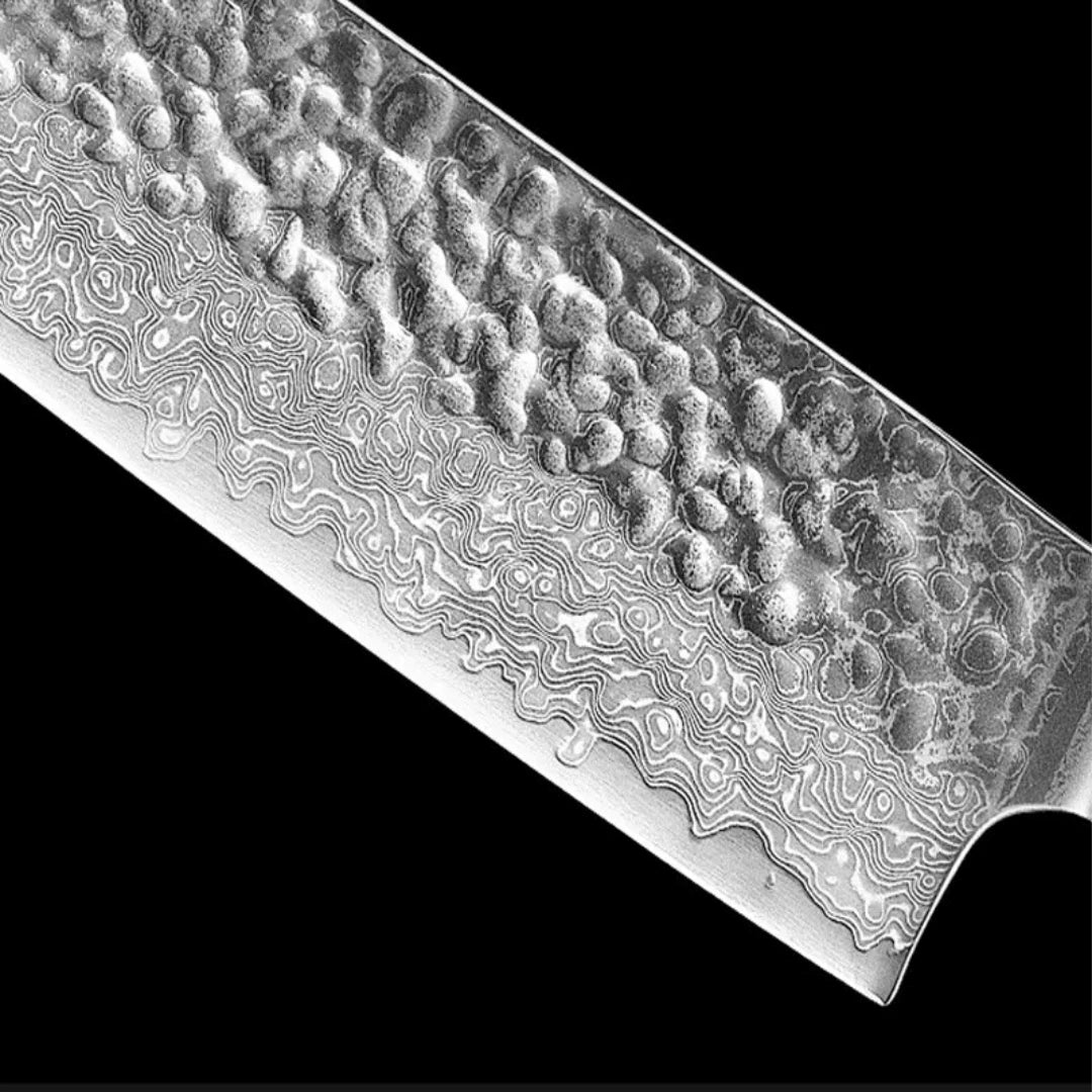 The blade is 67-layers of high carbon VG10 Damascus steel with a razor sharp edge.