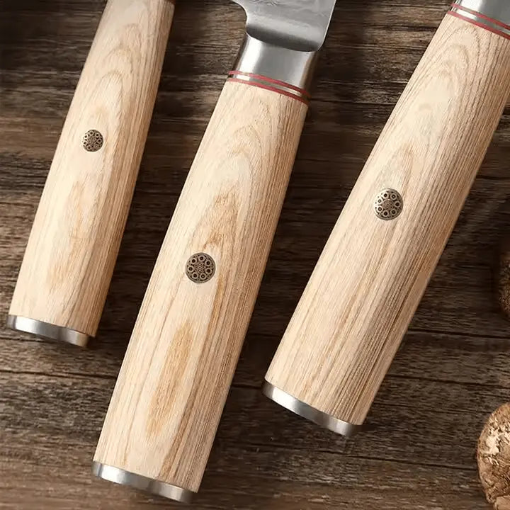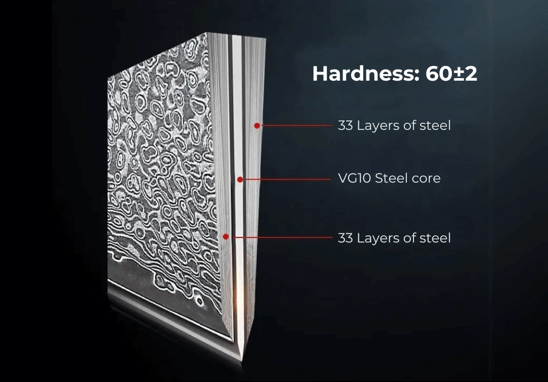A VG10 Japanese Steel core offers excellent hardness (60HRC), strong edge retention and makes it resistant to wear.
